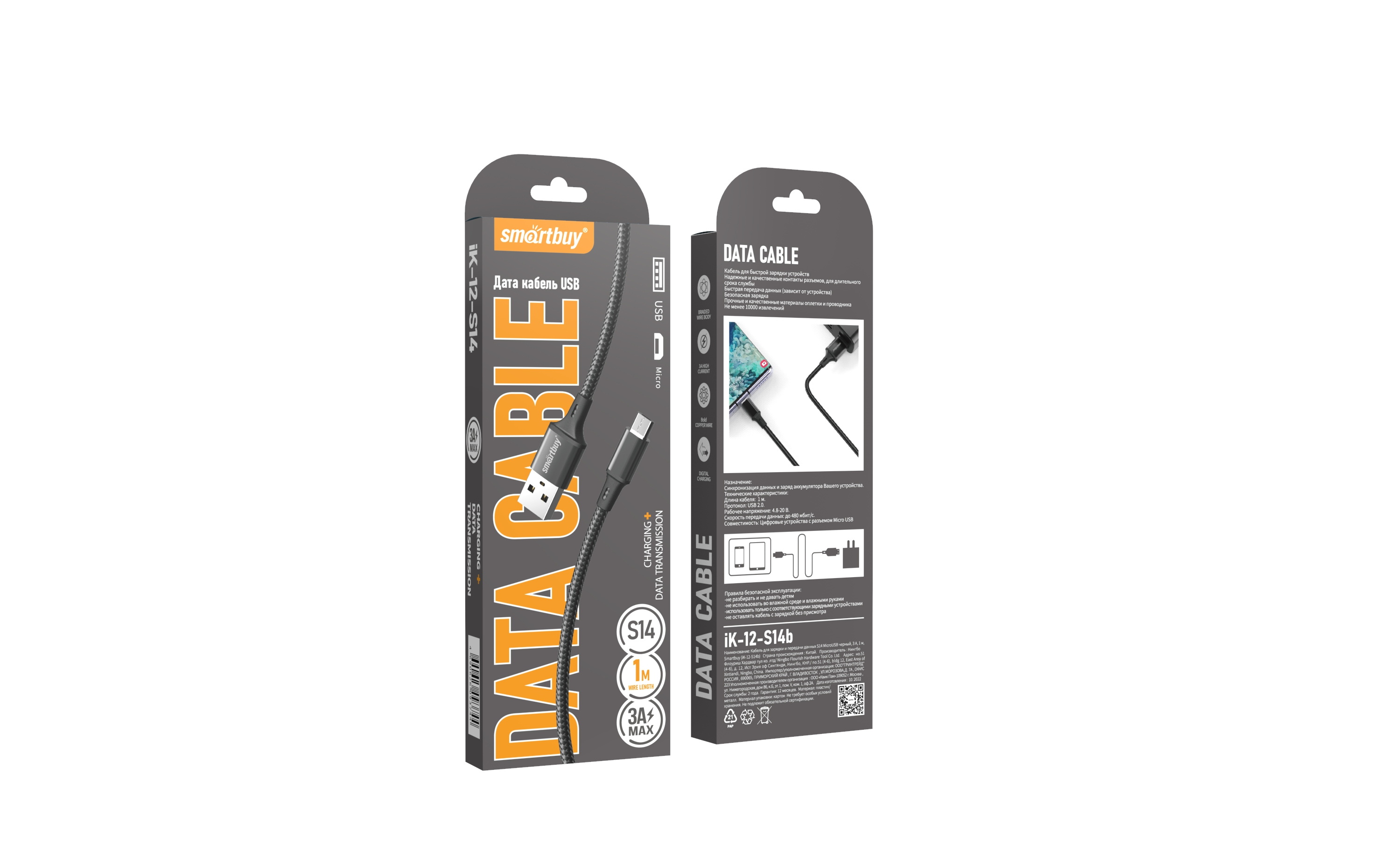 Кабель для зарядки и передачи данных S14 MicroUSB черный, 3 А, 1 м, Smartbuy (iK-12-S14b)