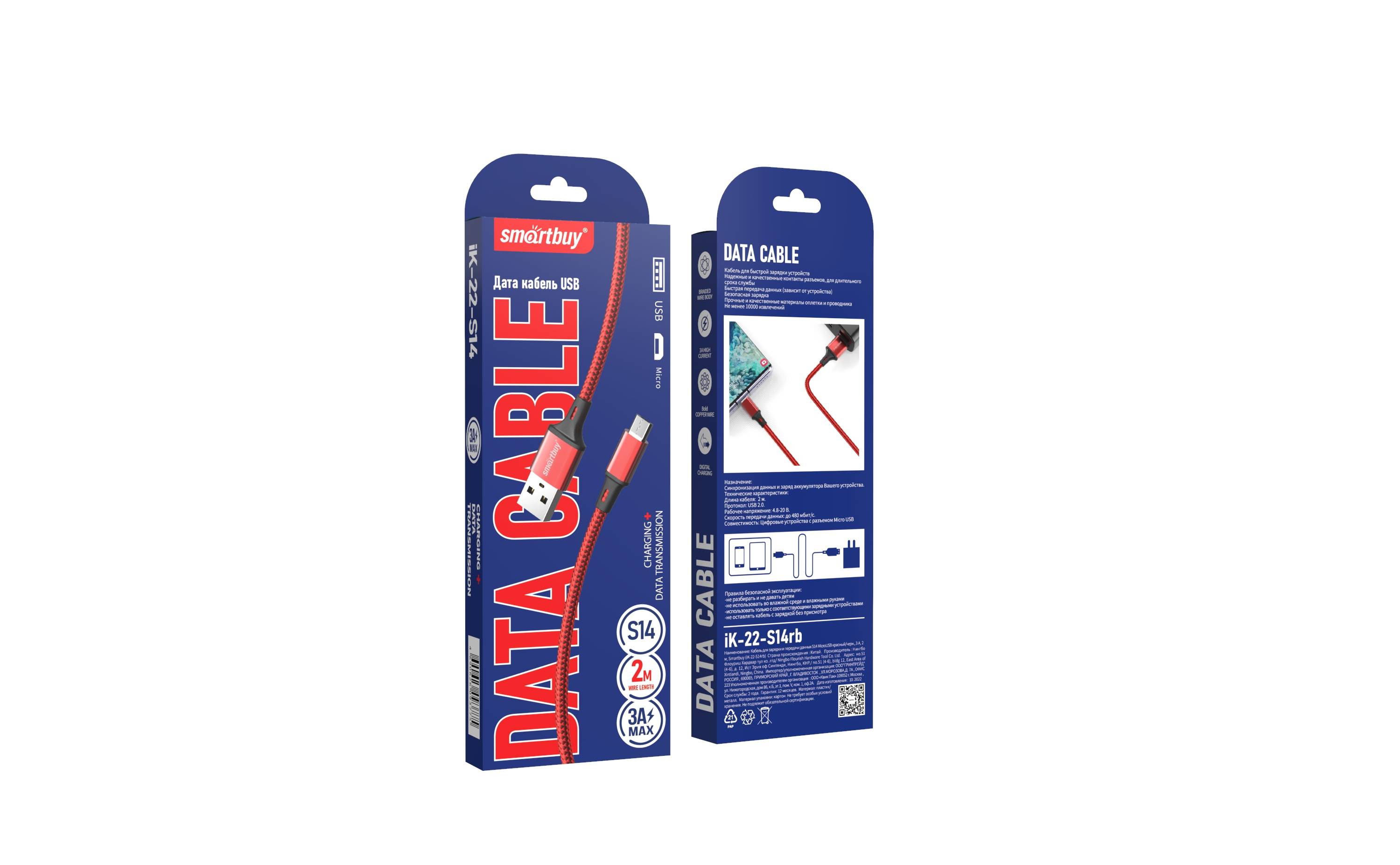 Кабель для зарядки и передачи данных S14 MicroUSB красный/черн., 3 А, 2 м, Smartbuy (iK-22-S14rb)