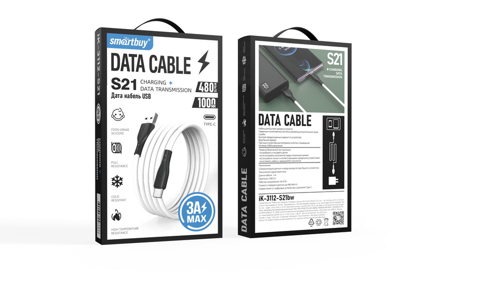 Кабель для зарядки и передачи данных S21 Type C белый, 3 А, сил., 1 м, Smartbuy (iK-3112-S21bw)