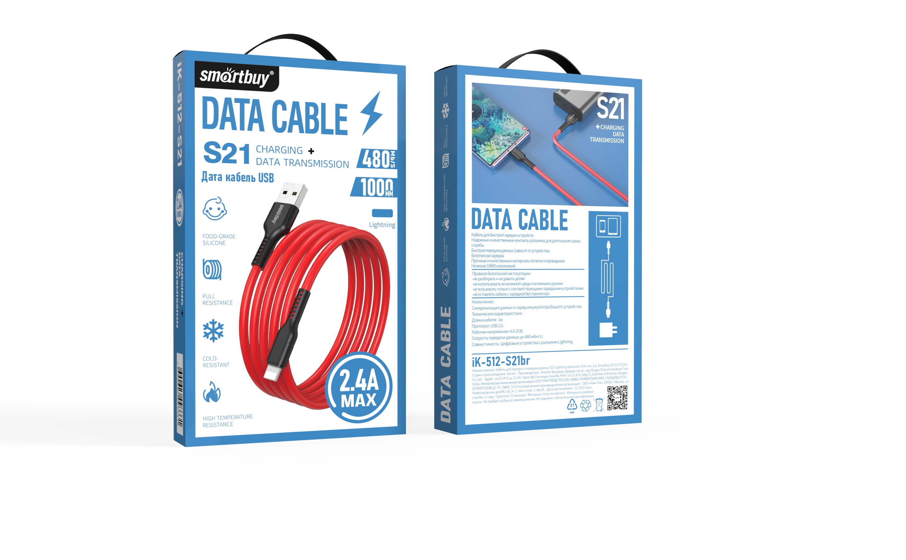 Кабель для зарядки и передачи данных S21 Lightning красный, 2.4 А, сил.,1 м, Smartbuy (iK-512-S21br)
