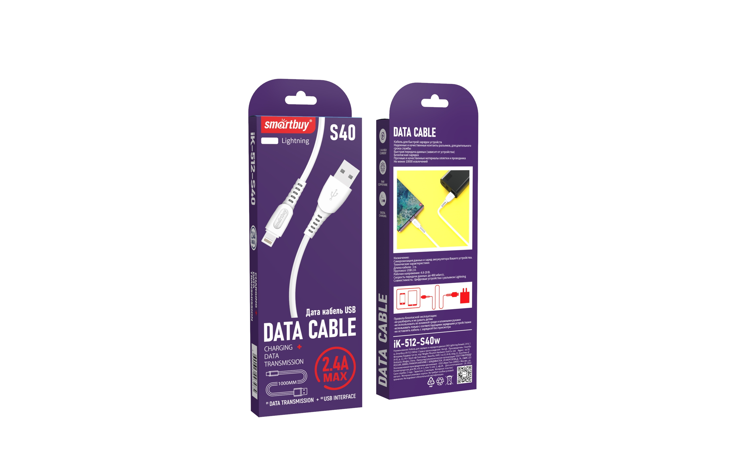 Кабель для зарядки и передачи данных S40 Lightning белый, 2.4 А, 1 м, Smartbuy (iK-512-S40w)