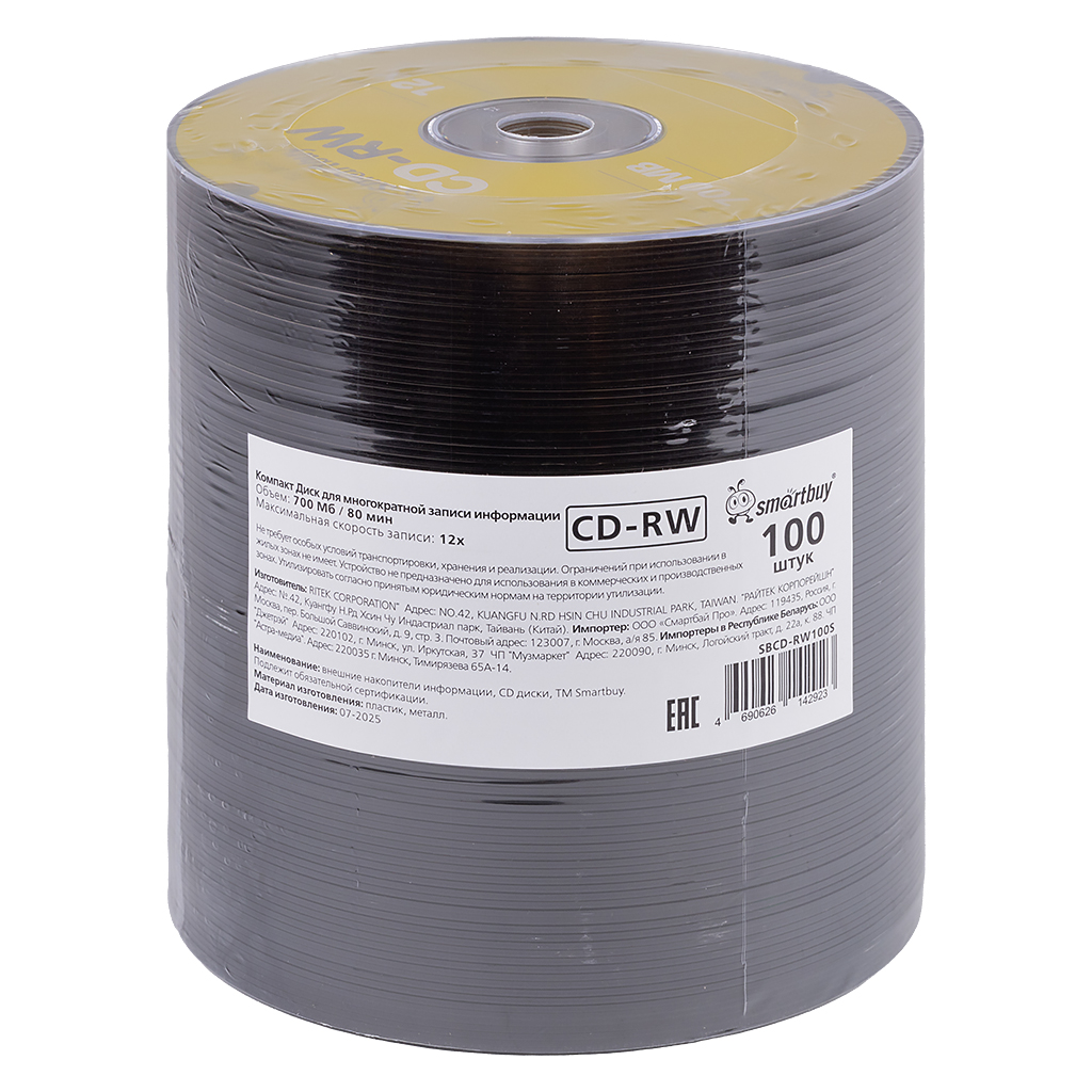 Диски для многократной записи SMARTBUY CD-RW, 700 Мб, 12х, в шпиле, 100шт (SBCD-RW100S)/600