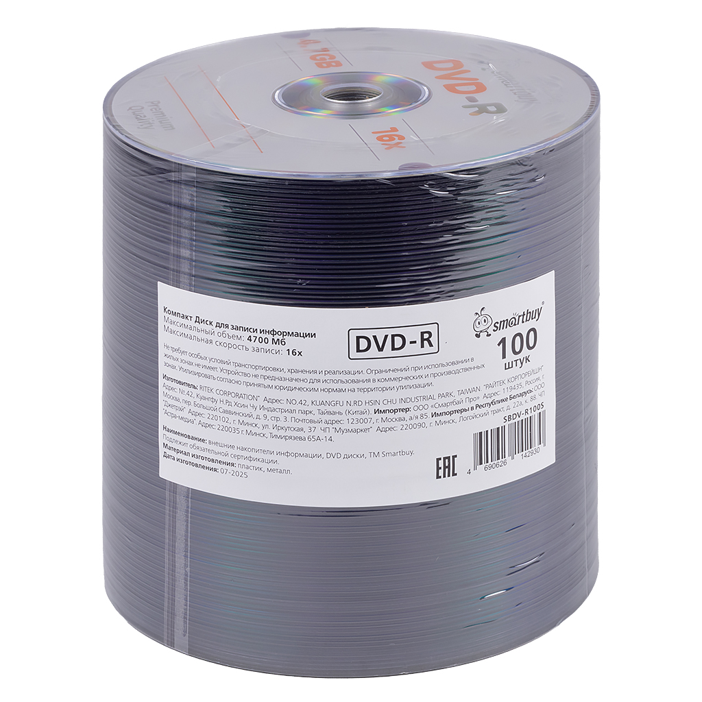 Диски для записи SMARTBUY DVD-R, 4.7 Гб, 16х, в шпиле, 100шт (SBDV-R100S)/600