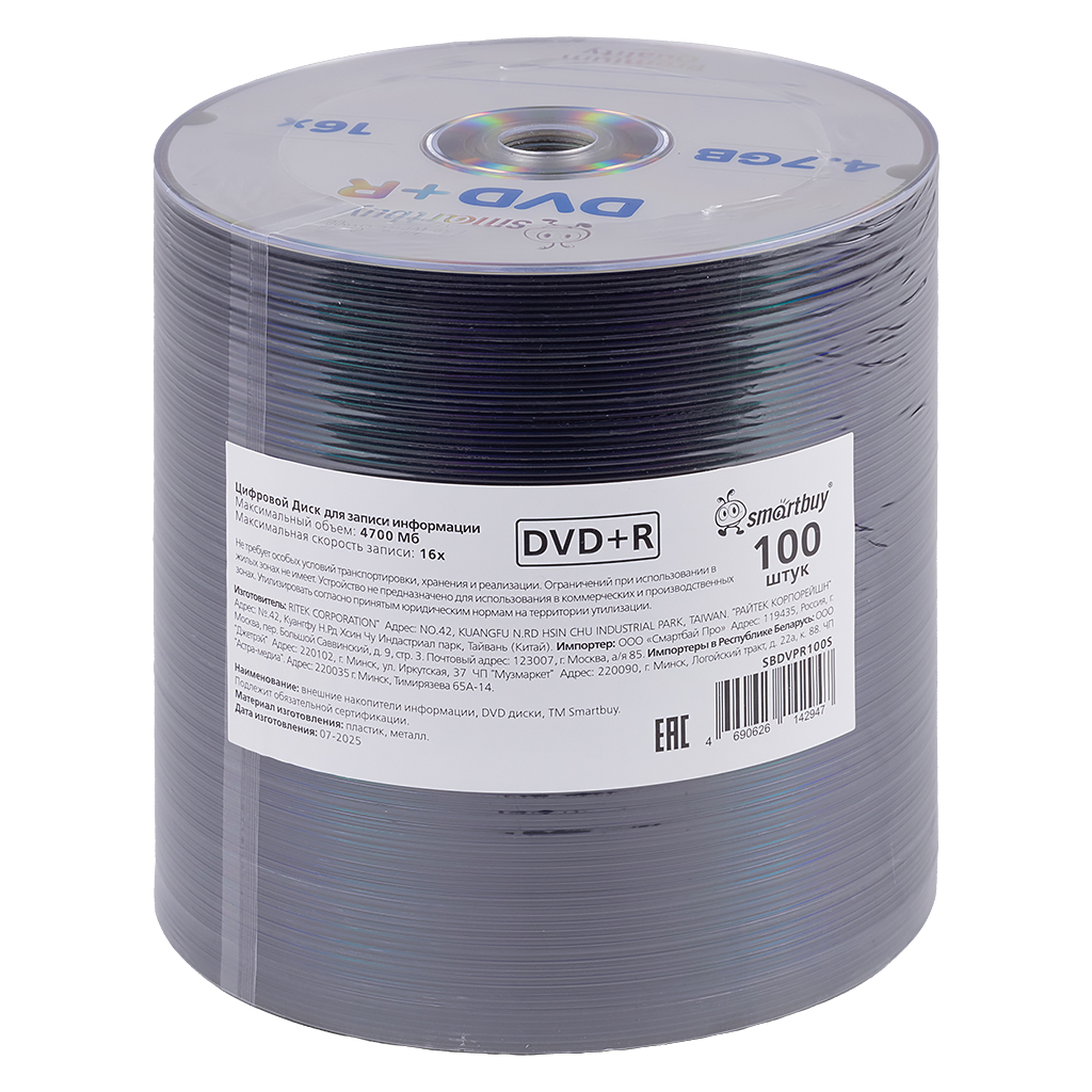 Диски для записи SMARTBUY DVD+R, 4.7 Гб, 16х, в шпиле, 100шт (SBDVPR100S)/600