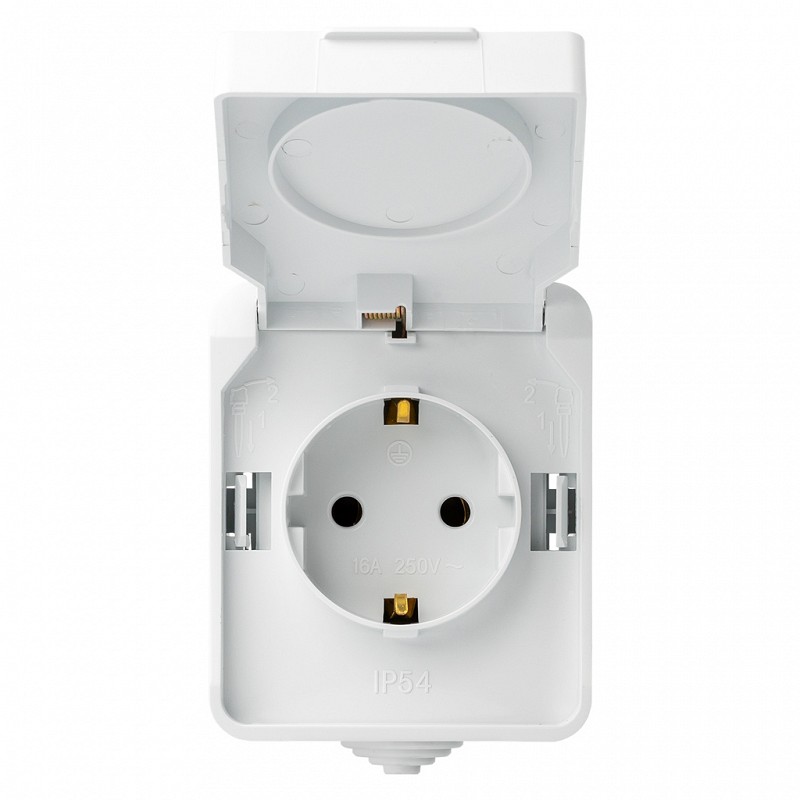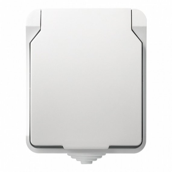 Розетка 1-местная с заземлением 16А с крышкой, IP54, белая, Сатурн (SBE-04g-16-S1-Z)
