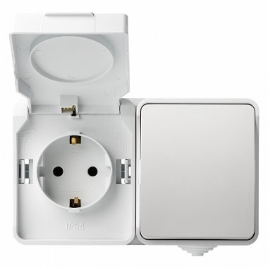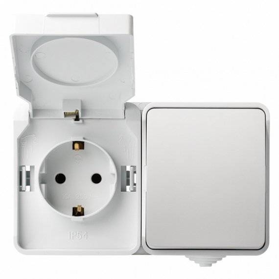 Блок розетка выключатель, выполненный в белом цвете и обладающий степенью защиты IP54. Идеально подходит для использования в условиях открытой установки. Продукт произведен компанией SMARTBUY и относится к серии Сатурн.