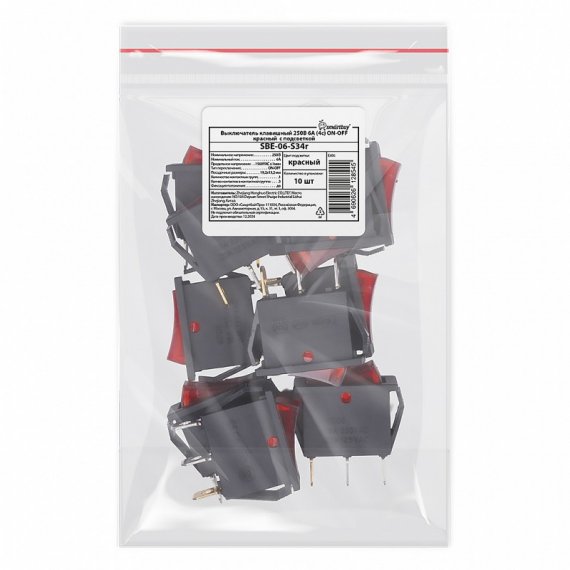 Выключатель клавишный 250В 6А (4с) ON-OFF красный с подсветкой (SBE-06-S34r)