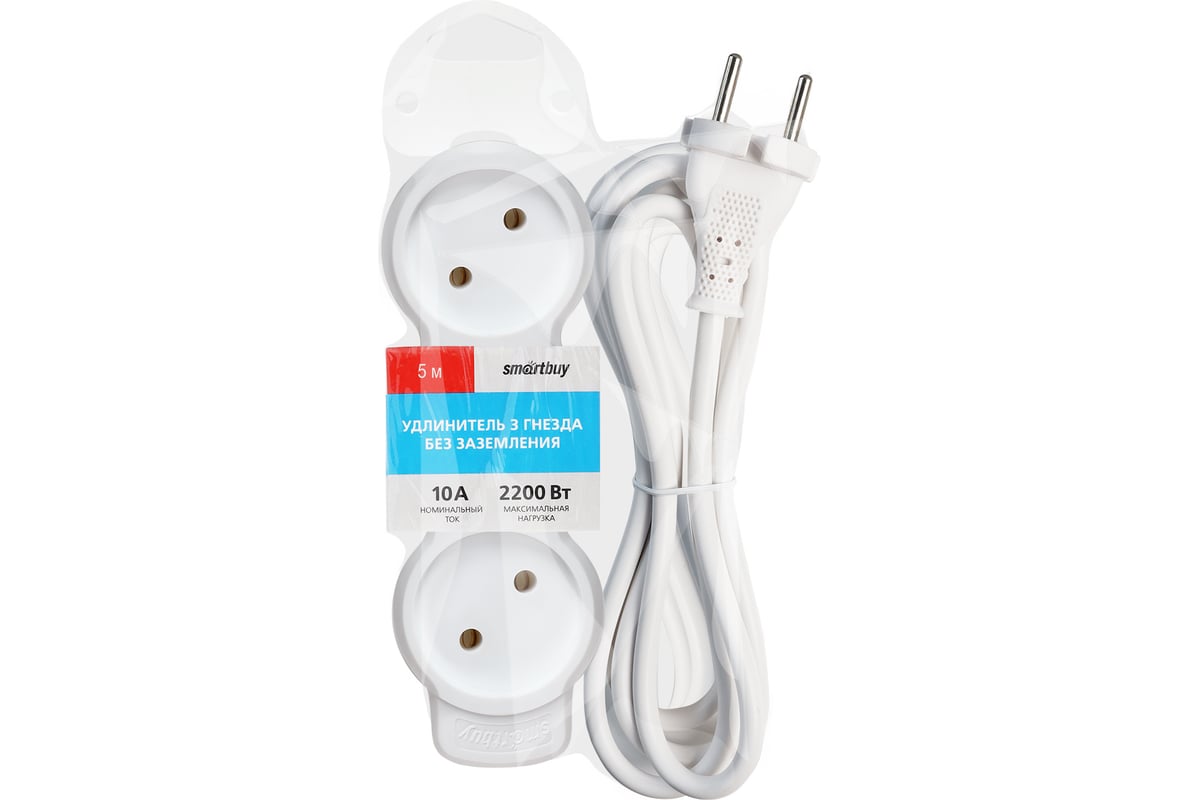 Технические характеристики Smartbuy 3 гнезда 5 метров 10А/2,2кВт без заземления ПВС 2x1,0 мм² SBE-10-3-05m-N