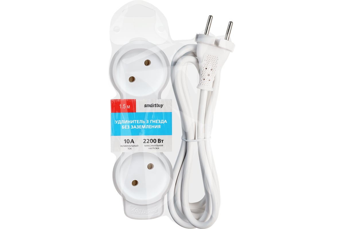 Технические характеристики Smartbuy 3 гнезда 1,5 метра 10А/2,2кВт без заземления ПВС 2x1,0 мм² SBE-10-3-1.5m-N