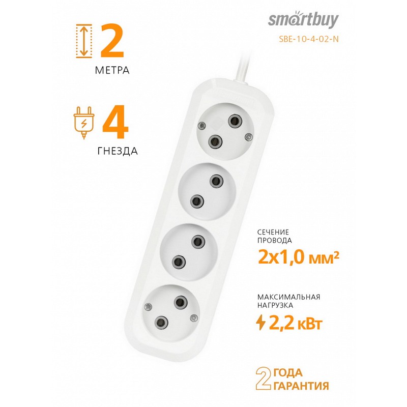 Технические характеристики Smartbuy 4 гнезда 2 метра 10А/2,2кВт без заземления ПВС 2х1,0 SBE-10-4-02-N
