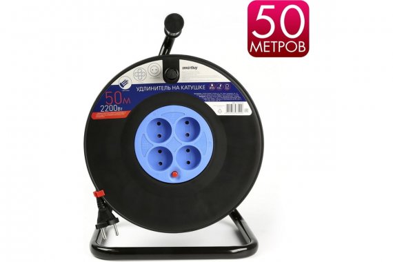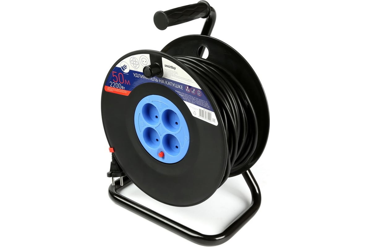 Удлинитель на катушке Smartbuy 4 гнезда, 50м без заземления, с предохранителем ПВС 2х1,0 10А/2,2кВт SBE-10-4-50-N предназначен для бытового использования - подключения электрических приборов низкой мощности, таких как, например, ручные электрические триммеры, электрические пилы, бытовые насосы.