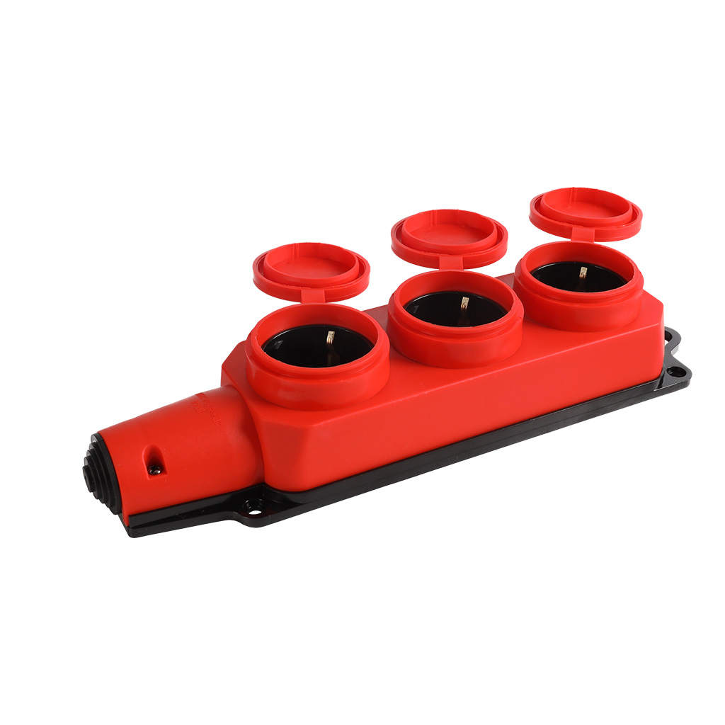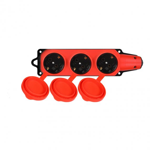 Розетка трехместная с защитными крышками каучуковая 230В, 2P+PE, 16A, IP44, красная (SBE-16-3-00-Rr)