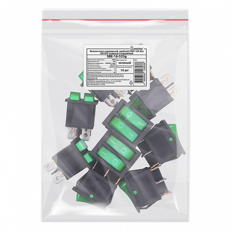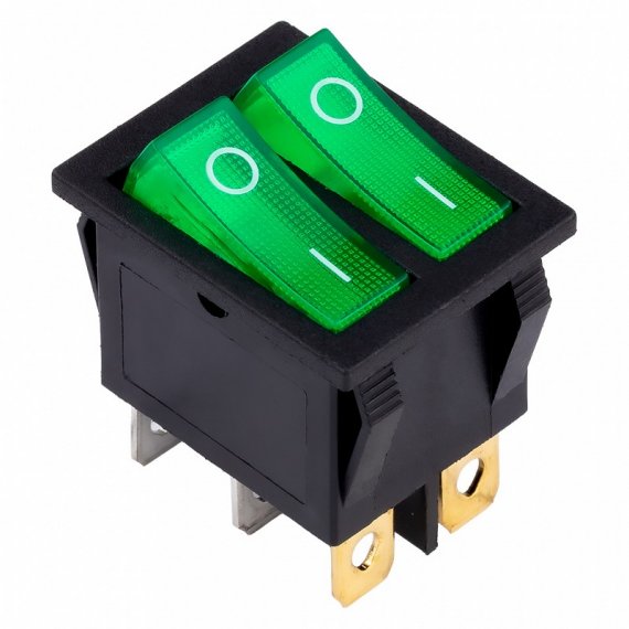 Выключатель клавишный двойной 250V 16А (6с) ON-OFF зеленый с подсветкой (SBE-16-S33g)
