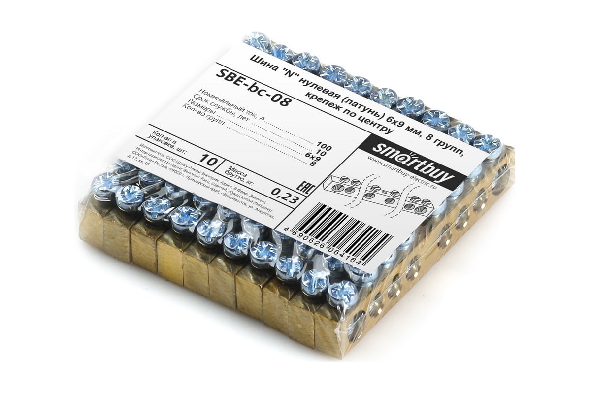 Шина "N" нулевая (латунь) 6х9мм, 8 групп, крепеж по центру, Smartbuy (SBE-bc-08)