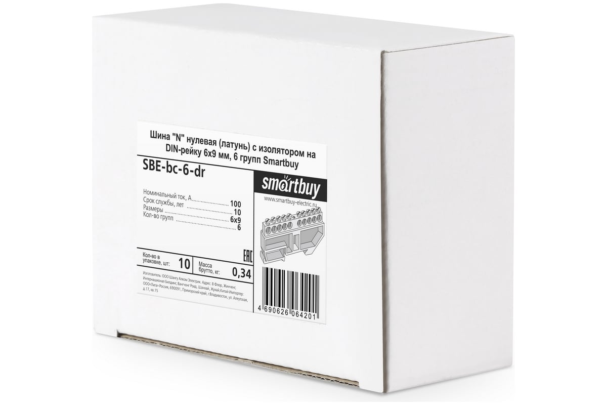 Технические характеристики Smartbuy "N" латунь с изолятором на DIN-рейку 6x9мм, 6 групп SBE-bc-6-dr
