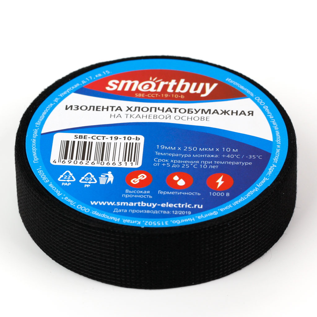 Изолента хлопчатобумажная Smartbuy, 0.25х19мм, 10 метров, черная (SBE-CCT-19-10-b)