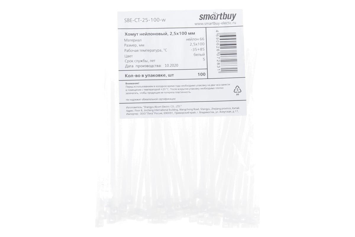 Технические характеристики хомута Smartbuy 2,5х100, белый