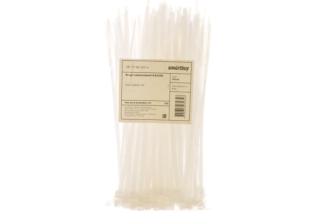 Хомут нейлоновый Smartbuy, 4,8х200, (упак. 100 шт.) белый (SBE-CT-48-200-w)/150