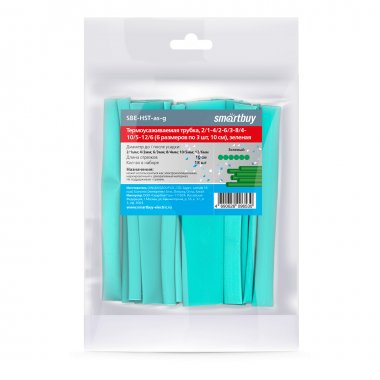 Термоусаживаемая трубка, 2/1-4/2-6/3-8/4-10/5-12/6 (6 р-ов по 3 шт, 10 см), зеленая (SBE-HST-as-g)