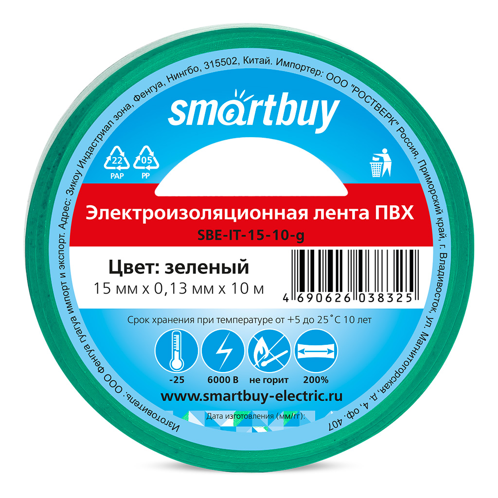 Изолента Smartbuy 0.13х15 мм, 10 метров, зеленая SBE-IT-15-10-g отличается высокой гибкостью и адгезией. Изделие позволяет проводить разметку проводов, их электроизоляцию или ремонт.