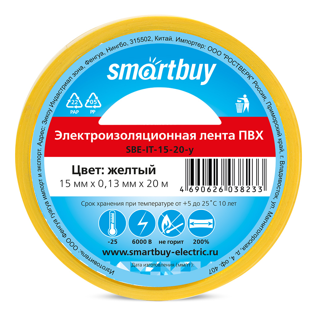 Технические характеристики изоленты Smartbuy 0.13х15 мм, 20 метров, желтая