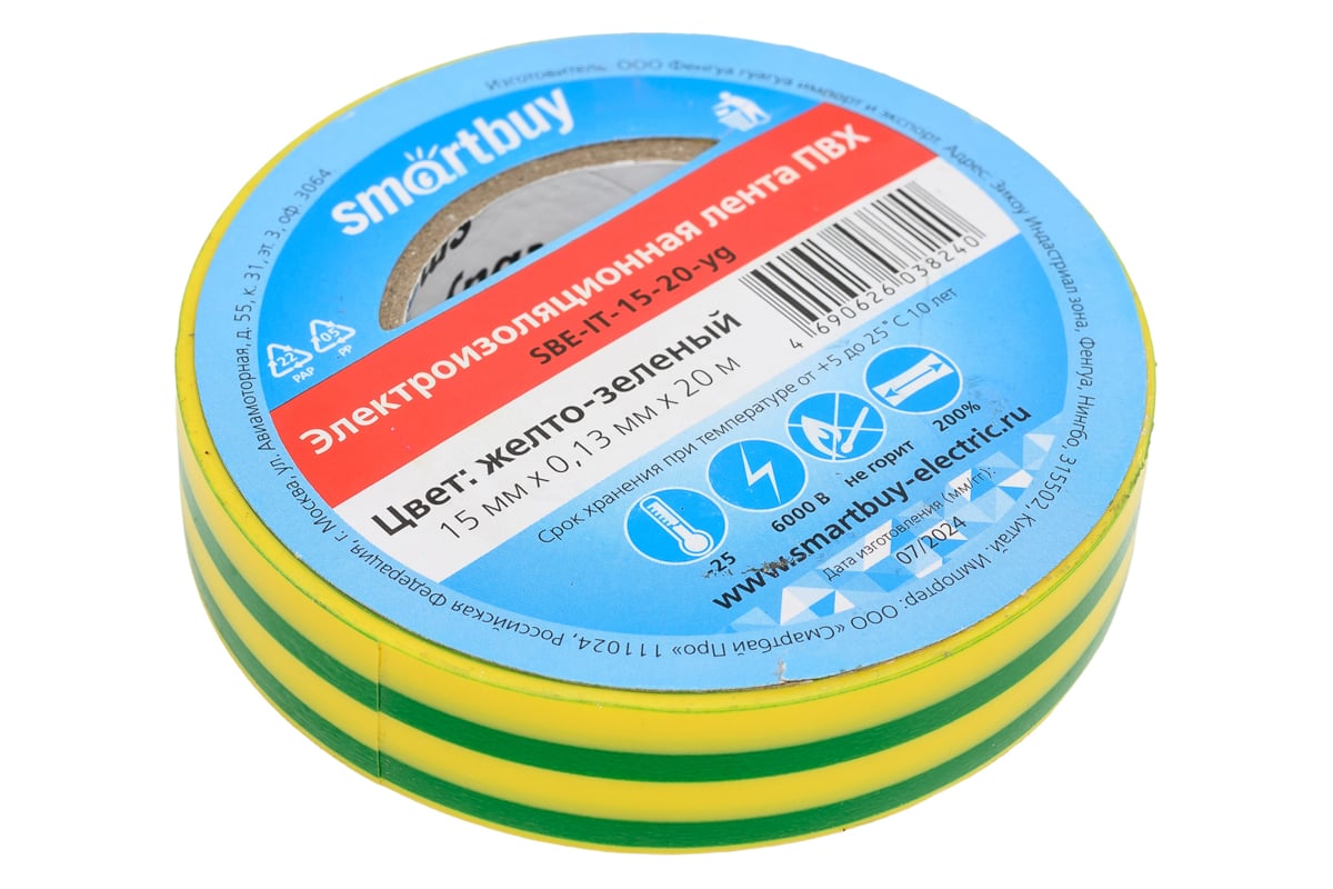 Технические характеристики изоленты Smartbuy 0.13х15 мм, 20 метров, желто-зеленая