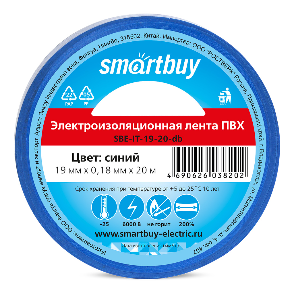 Технические характеристики изоленты Smartbuy 0.18х19 мм, 20 метров, синяя