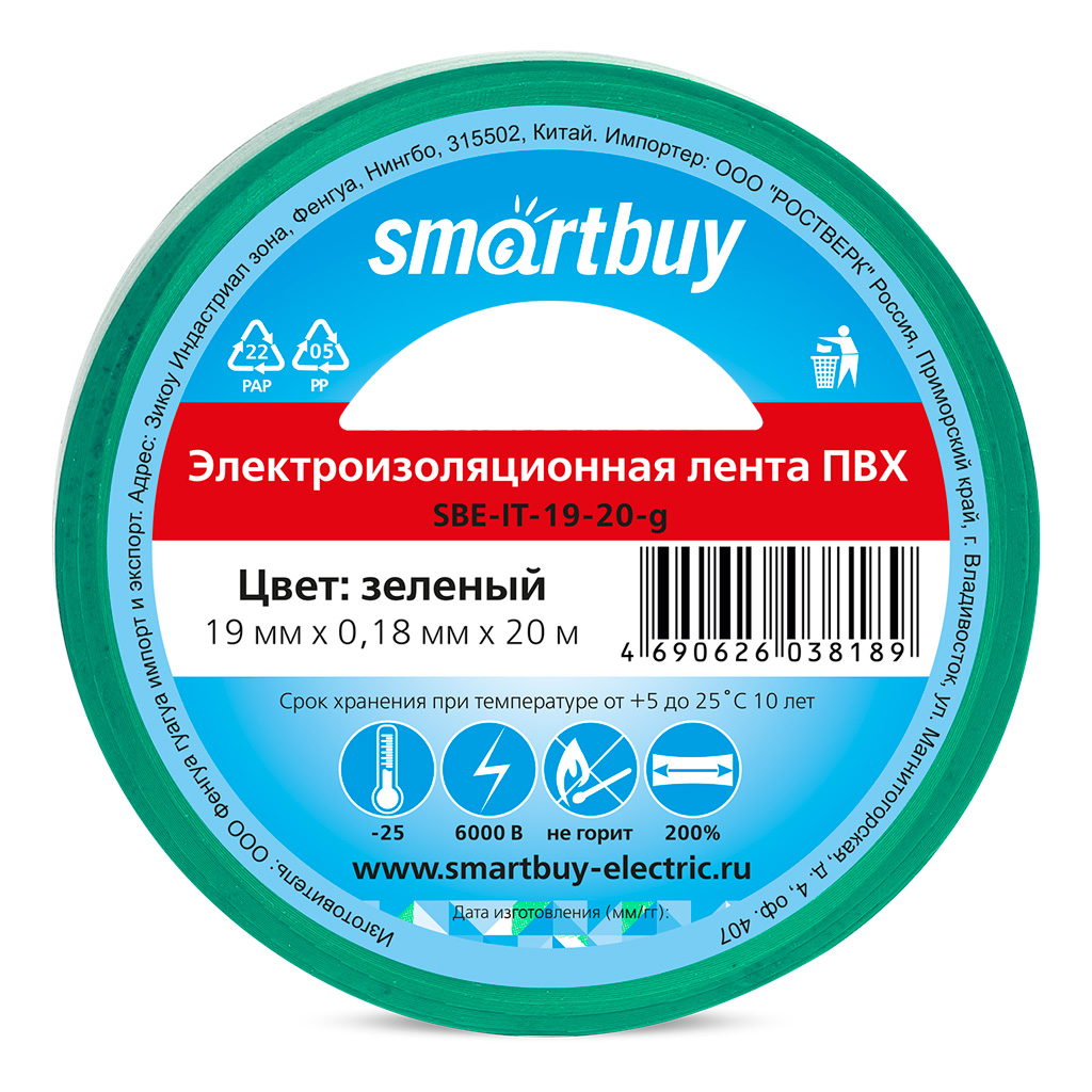 Изолента Smartbuy, 0.18х19мм, 20 метров, зеленая (SBE-IT-19-20-g)