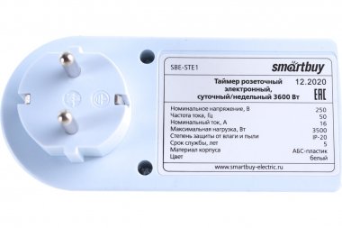 Дополнительная техническая информация розетки с электронным таймером Smartbuy недельный+суточный 3600Вт SBE-STE1:10 программ ON/OFF (ВКЛ/ВЫКЛ) с шагом 1 минута