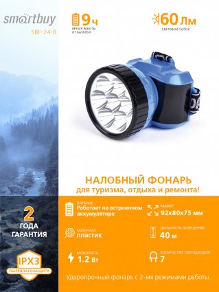 Аккумуляторный налобный фонарь 7 LED Smartbuy, синий (SBF-24-B)/120