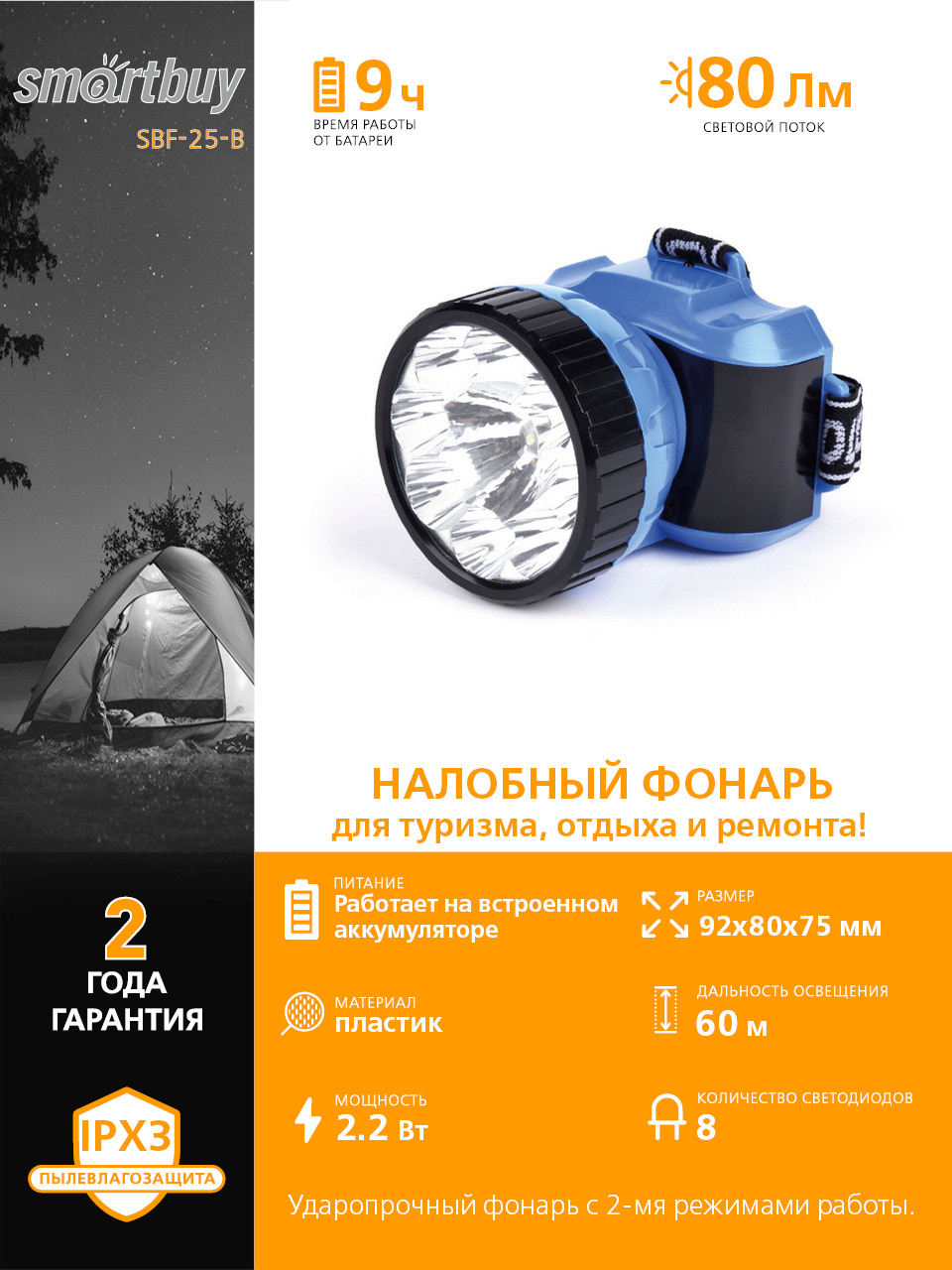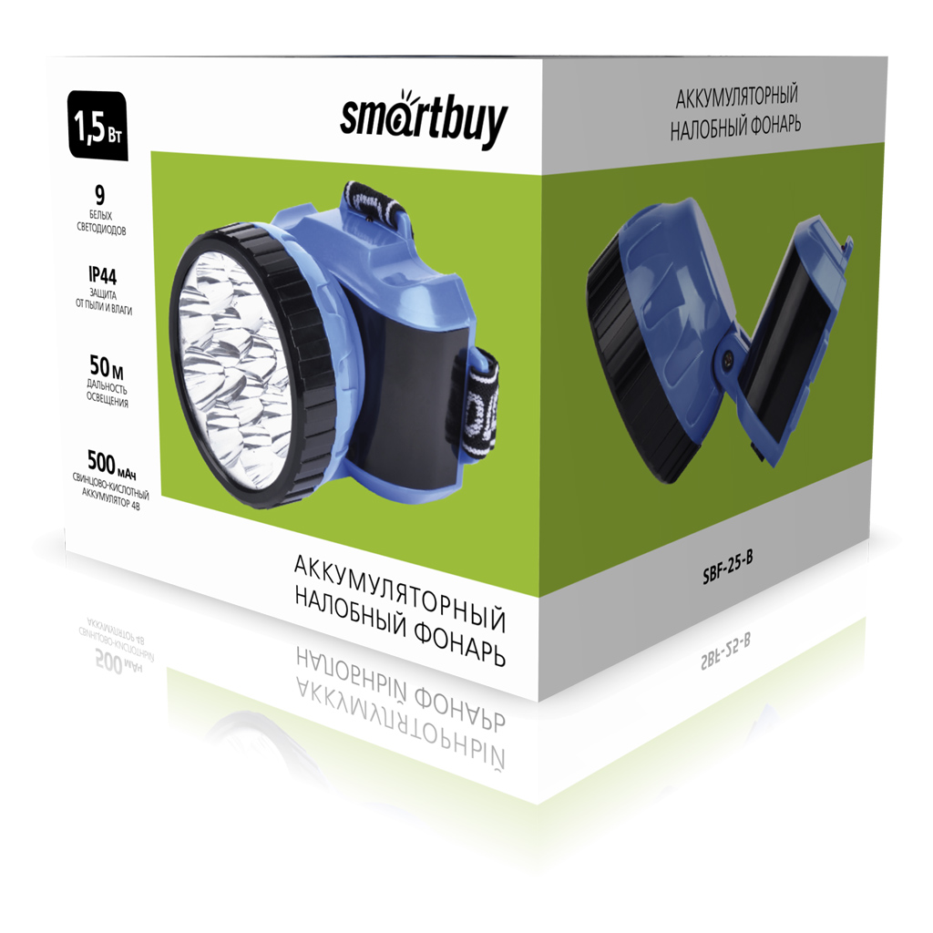 Аккумуляторный налобный фонарь 1ВТ + 8 LED Smartbuy, синий (SBF-25-B)/120
