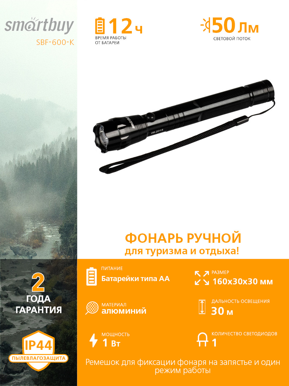 Smartbuy SBF-600-K Светодиодный алюминиевый фонарь 1Вт Smartbuy 2AA
