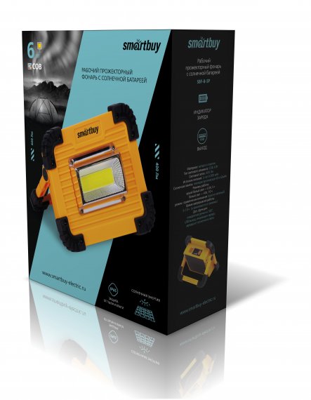 Рабочий прожекторный фонарь Smartbuy с солнечной батареей SBF-8-SP имеет поворотную ручка на 180°, USB выход и индикацию заряда. Зарядка от солнечного света. Солнечная панель: поликристаллическая 4 Вх60мАч. Тип светового элемента COB, 6 Вт.