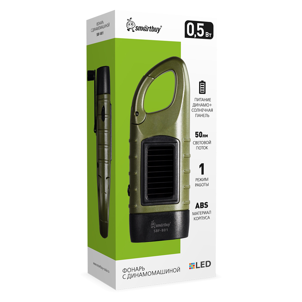 Фонарь Smartbuy SBF-801 с зарядкой от солнечной панели и динамомашины, позволит не остаться без света в любых условиях.