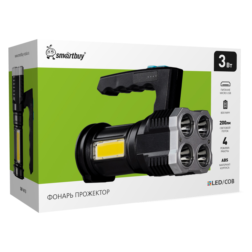 Фонарь прожектор Smartbuy SBF-813 с 7 LED светодиодами осветит необходимую площадь, а также боковая COB сборка светодиодов позволяет использовать фонарь в качестве ночника.