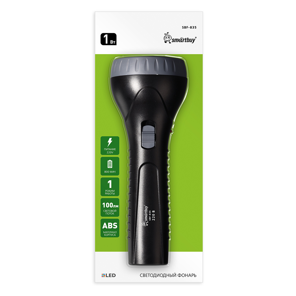 Smartbuy SBF-835 Фонарь LED с зарядкой от сети 220 В встроенная вилка, ABS, 22х7 см