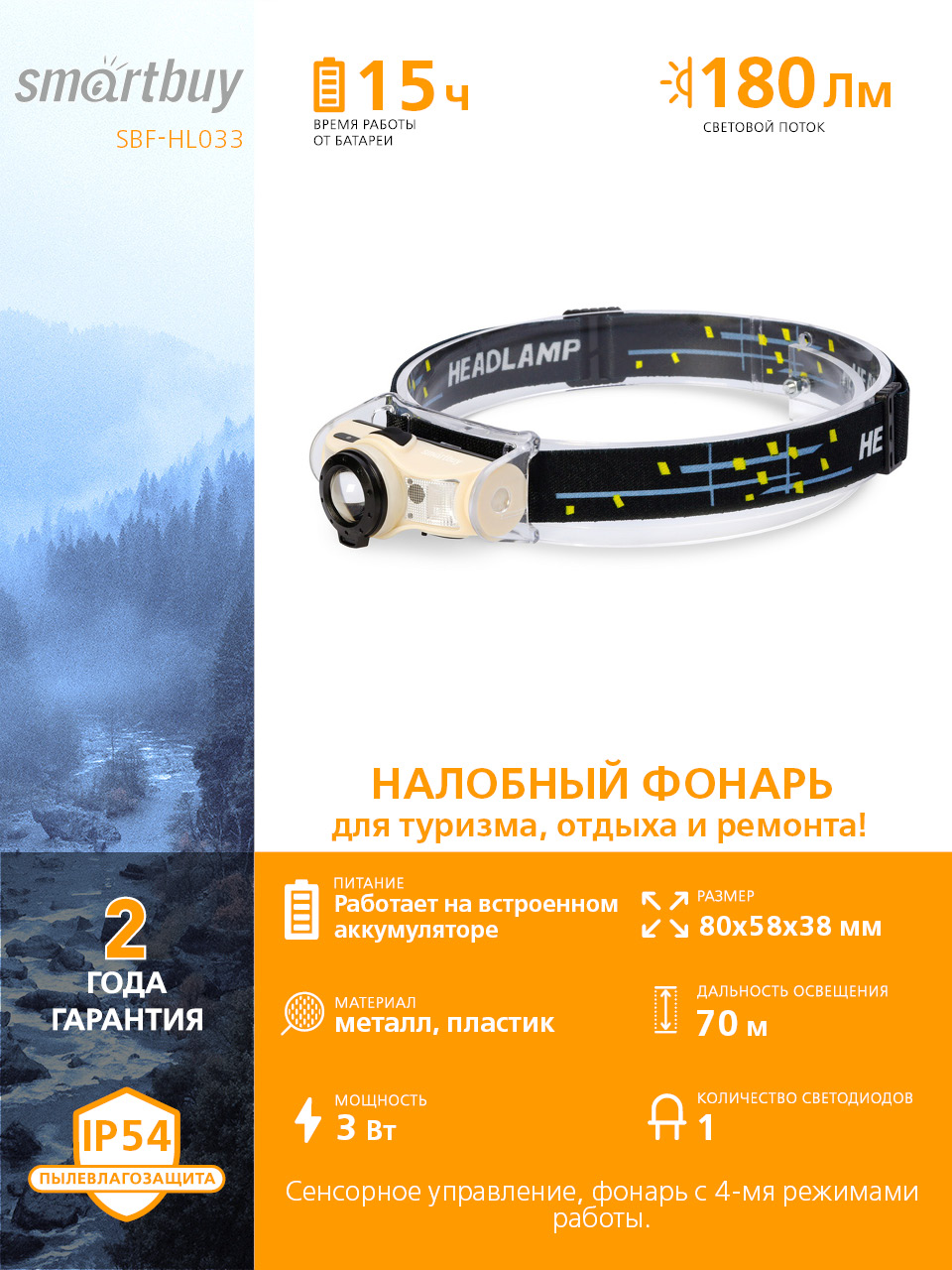 Аккумуляторный налобный фонарь Smartbuy с сенсорным управлением SBF-HL033 имеет 4 режима работы и оснащен светодиодом LED Cree XPE 3 Вт. Режимы работы: дальний свет, ближний свет, аварийный маяк. Дополнительные возможности: фокусировка светового луча, сенсорное управление, индикатор заряда аккумулятора.