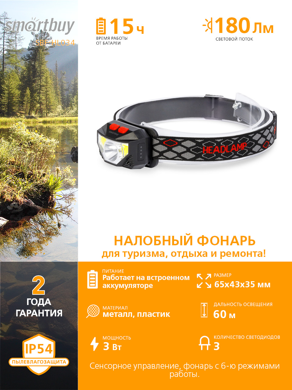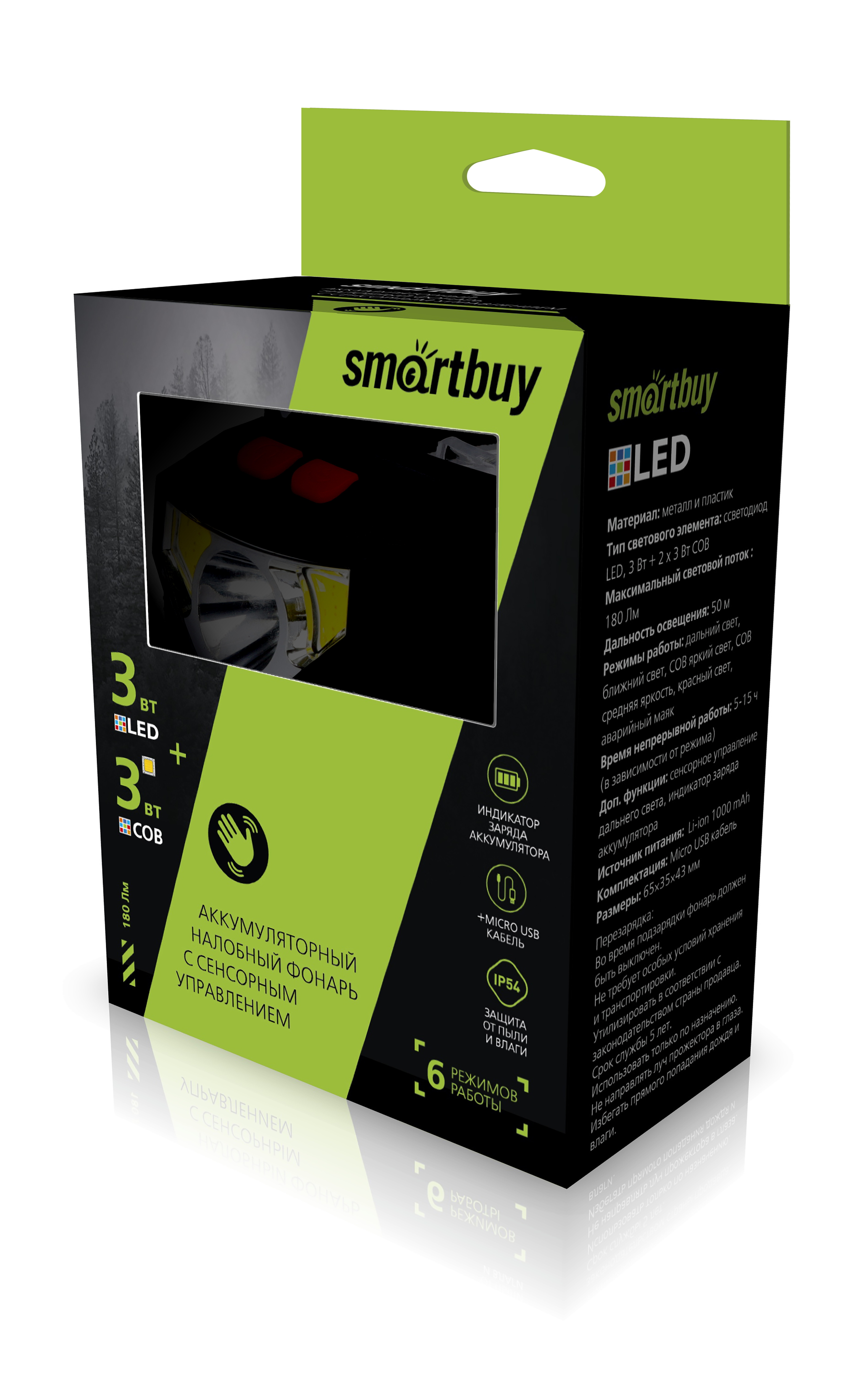 Аккумуляторный налобный фонарь Smartbuy с сенсорным управлением SBF-HL034 имеет 6 режимов работы: дальний свет, ближний свет, COB яркий свет, COB ближний свет, красный свет, аварийный маяк. Дополнительные возможности: сенсорное управление, индикатор заряда аккумулятора.