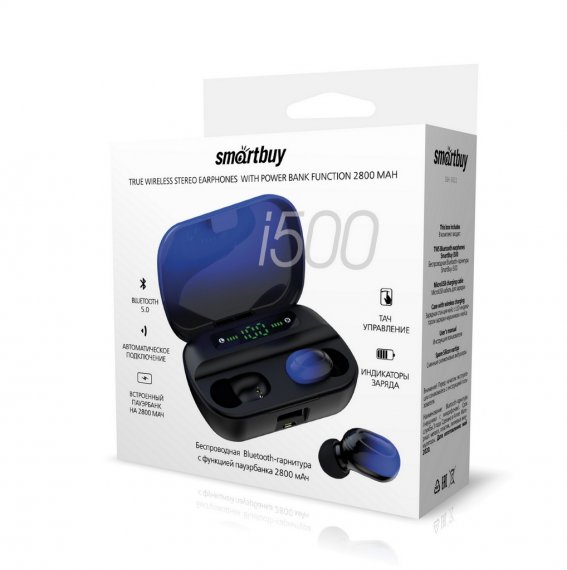 Внутриканальная TWS Bluetooth-гарнитура Smartbuy i500,Touch, пауэрбанк 2800мАч, черн-синяя(SBH-3022)