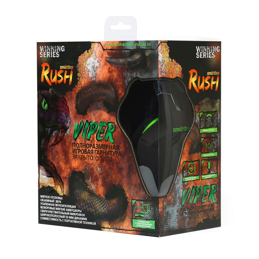 Игровая гарнитура RUSH VIPER, динамики 50мм, велюр. амбушюры, переходник для ПК, черн/зел(SBHG-2100)