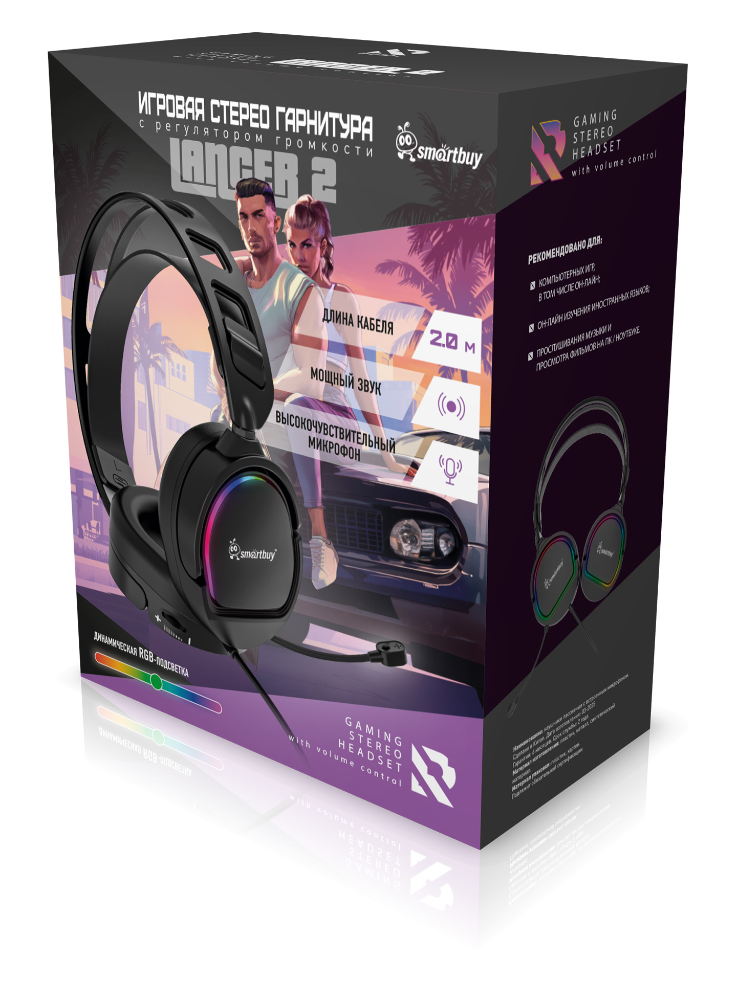 Игровые наушники Smartbuy LANCER 2, подсветка, 50мм динамик, кабель 2м, 2 х 3.5мм + USB (SBHG9810)