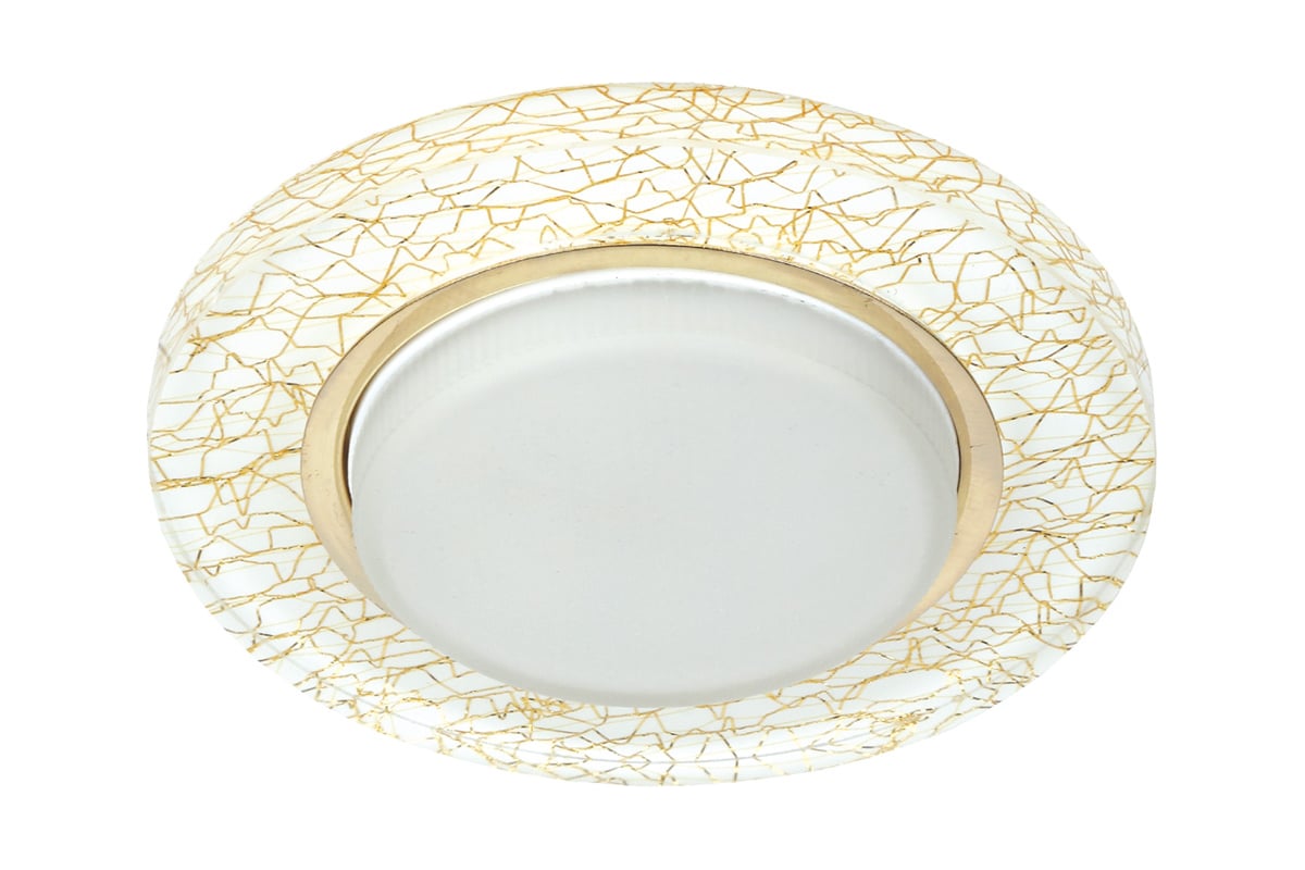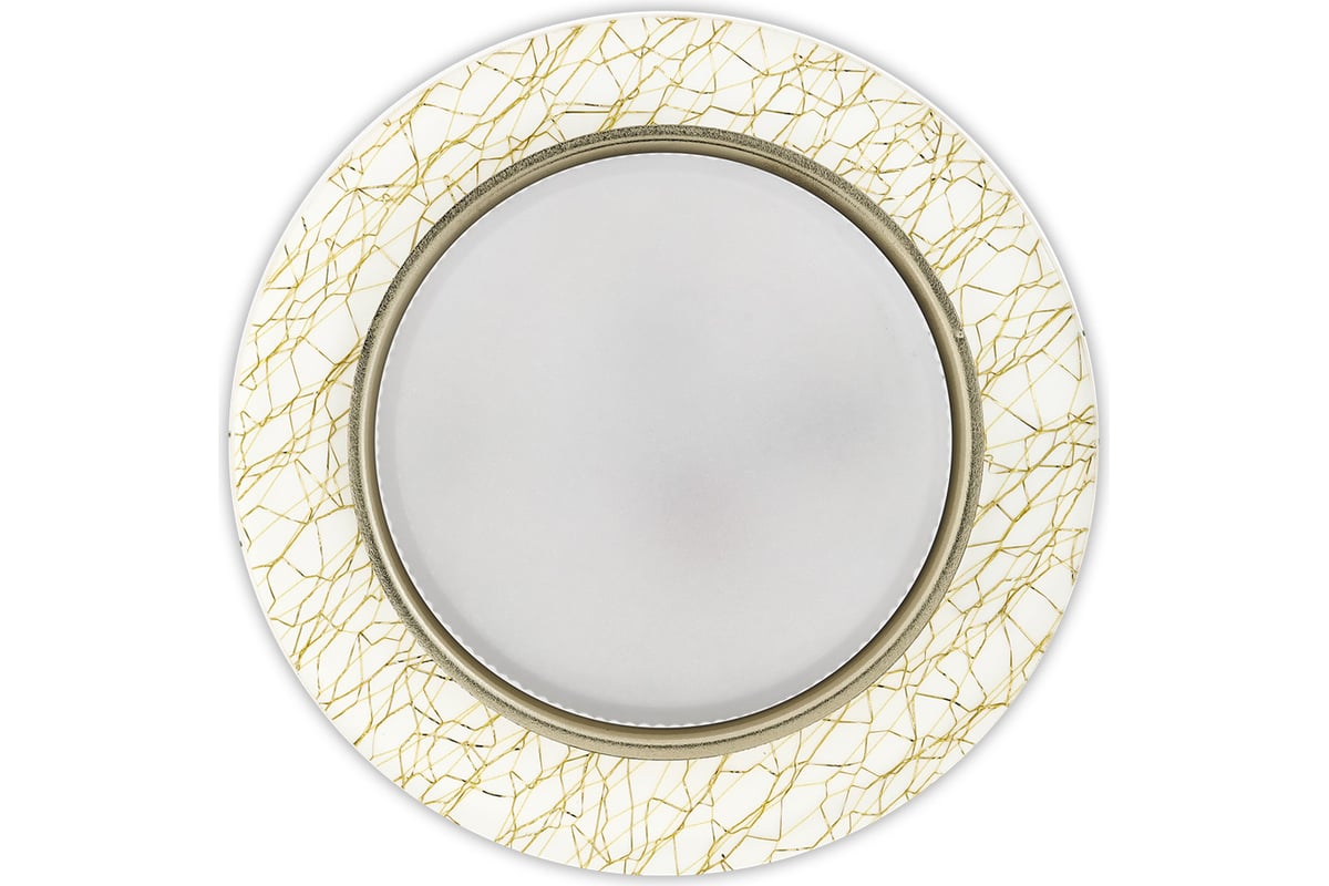Встраиваемый светильник из стекла под лампу GX53 белого цвета с золотым рисунком предназначен для точечного или декоративного освещения внутри помещения. Работает со сменными лампами с патроном GX53.