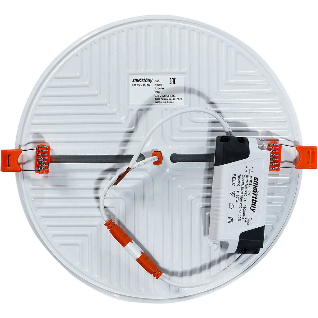 Светодиодный безрамочный светильник Smartbuy BDL круг 36Вт00К SBL-BDL-36-4K предназначен для монтажа в подвесные, гипсокартонные, натяжные или реечные потолки. Монтаж производится с помощью зажимных пружин в заранее подготовленное отверстие, и видимой остается только декоративная часть корпуса.