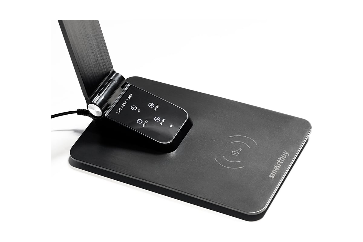 Светодиодный настольный светильник Smartbuy Несо с беспроводной зарядкой, 11 Вт, черный SBL-DL-11-wc-b с сенсорным управлением имеет пять уровней яркости и пять режимов цветовой температуры. Оснащен функцией беспроводной зарядки. Длина провода1,5 м.