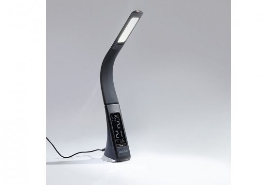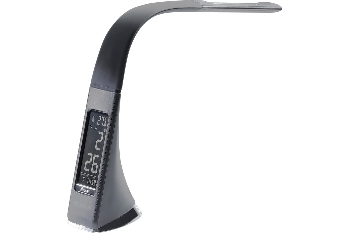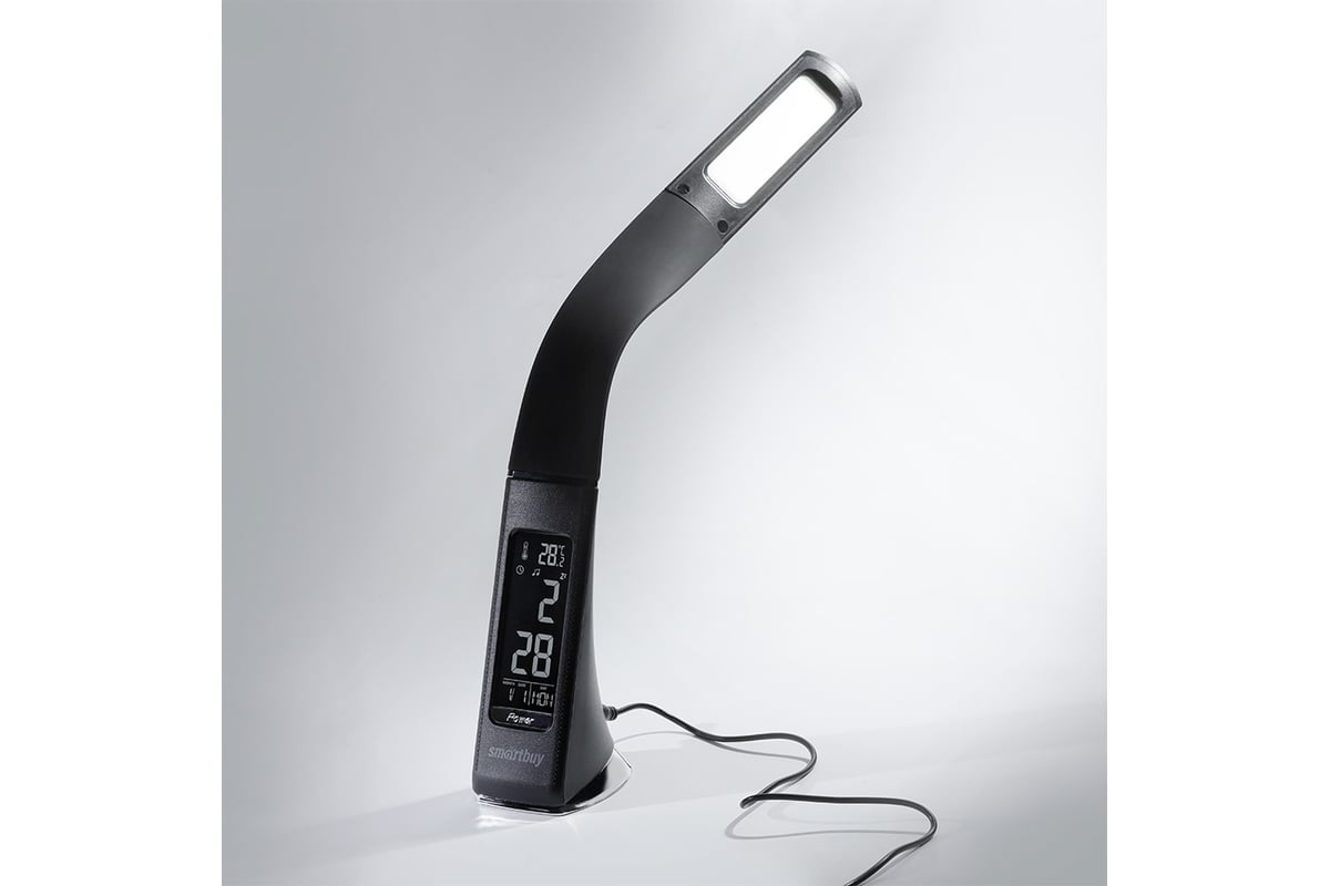 Светодиодный настольный светильник Smartbuy Наяда, 7 Вт, черный SBL-DL-7-b имеет три уровня яркости, три режима цветовой температуры. Цветовая температура основного света: 3000-6500К.Световой поток: 400 Лм. Функции дисплея: часы, будильник, календарь, температура. Длина провода 1,5 м.