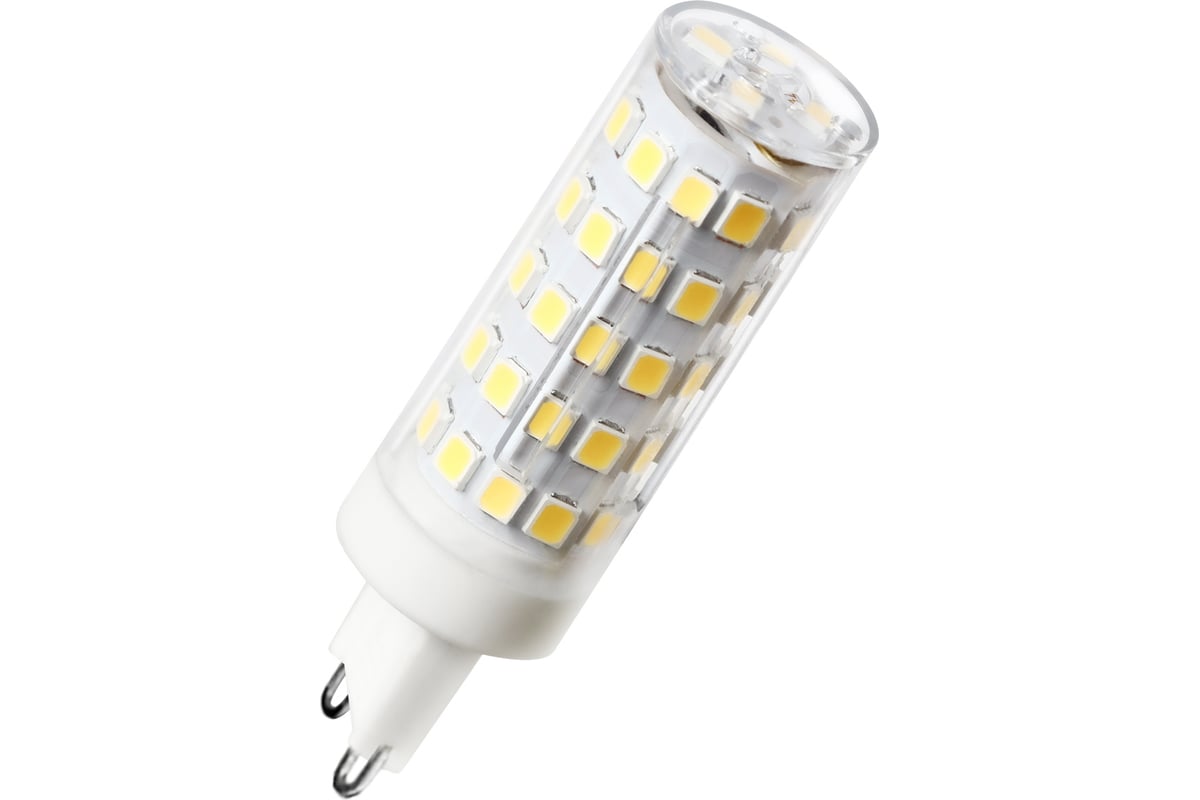 Светодиодная лампа общего и декоративного освещения. Колба лампы выполнена в форме капсулы. Лампа G9 повторяет форму и размеры стандартных галогенных капсульных ламп и идеально подходит к любому светильнику, в котором используются данные типы ламп. Сочетает в себе компактный размер и особую яркость. В светодиодных лампах серий G9 применяются высокоэффективные светодиоды, что обеспечивает высокую надежность и эффективность источников света до 80 лм/Вт. При этом коэффициент цветопередачи обеспечивается на уровне Ra>80.