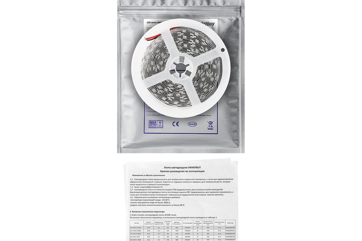 Двухслойная светодиодная LED лента SmartBuy сконструирована на базе светодиодов Epistar в корпусе 5050. Лента выпускается на гибкой печатной плате белого цвета шириной 8 мм и поставляется в катушках по 5 м. Каждая катушка с лентой SmartBuy укомплектована проводами для подключения к источнику питания. Срок службы светодиодной ленты Smartbuy составляет 30 000 часов.