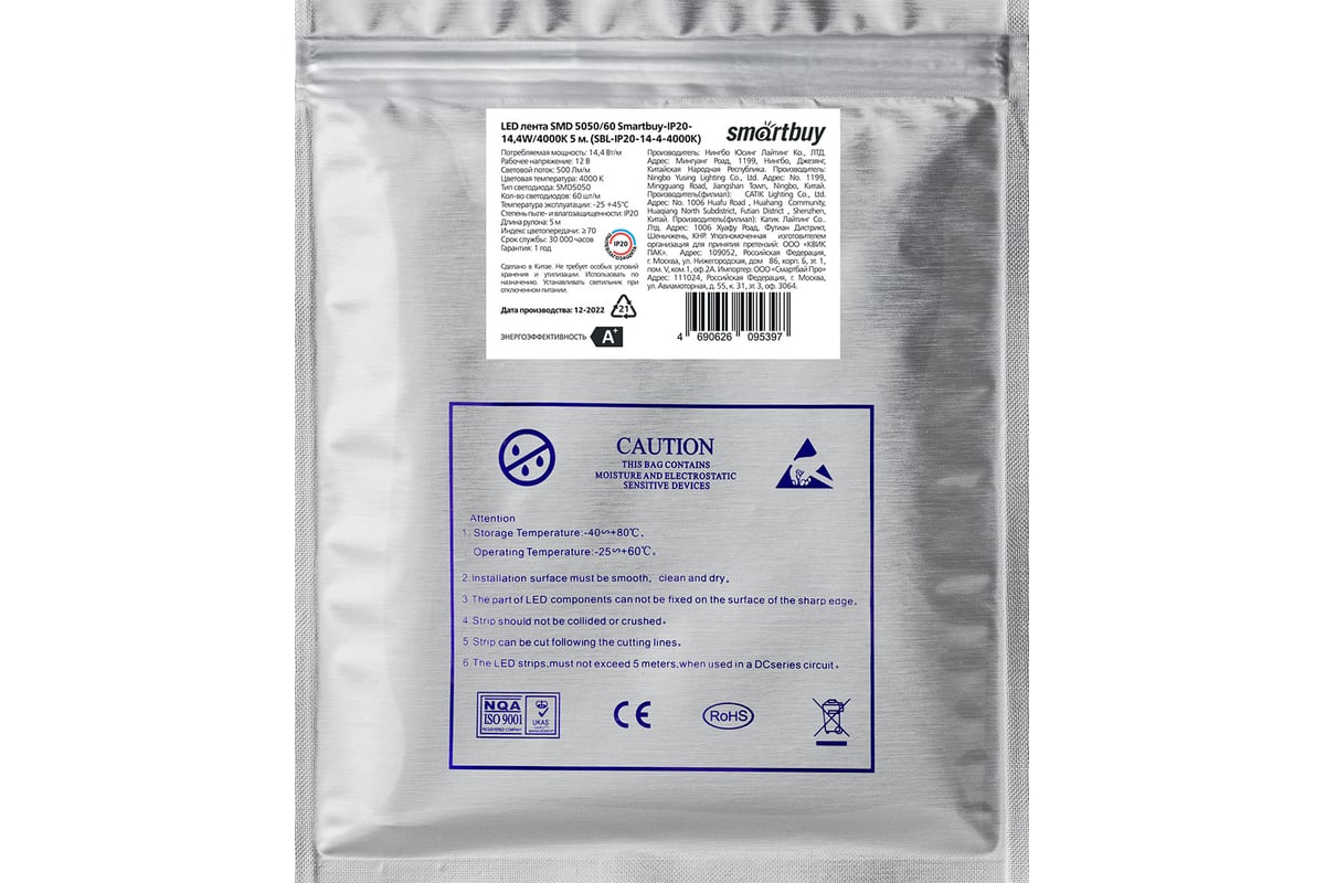 Технические характеристики Smartbuy SMD 5050/60 -IP20-14,4W/4000K 5 м. SBL-IP20-14-4-4000K