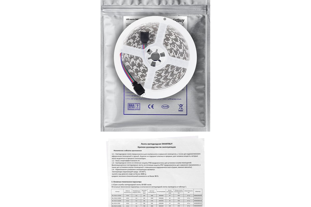 Двухслойная светодиодная LED лента SmartBuy сконструирована на базе светодиодов Epistar в корпусе 5050. Лента выпускается на гибкой печатной плате белого цвета шириной 8 мм и поставляется в катушках по 5 м. Каждая катушка с лентой SmartBuy укомплектована проводами для подключения к источнику питания. Срок службы светодиодной ленты Smartbuy составляет 30 000 часов.