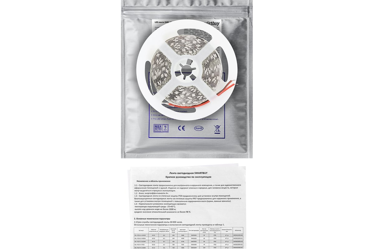 Двухслойная светодиодная LED лента SmartBuy сконструирована на базе светодиодов Epistar в корпусе 2835. Лента выпускается на гибкой печатной плате белого цвета шириной 8 мм и поставляется в катушках по 5 м. Каждая катушка с лентой SmartBuy укомплектована проводами для подключения к источнику питания. Срок службы светодиодной ленты Smartbuy составляет 30 000 часов.